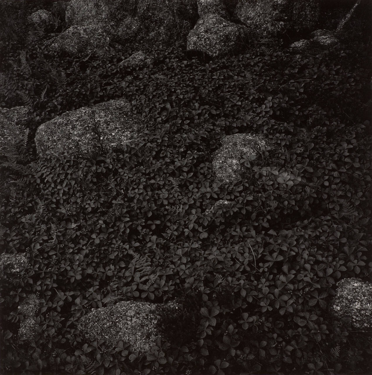 DescriptionImage of textured rocks scattered in a dark landscape filled with vining foliage.Copyright© The Estate of Harry Callahan. Courtesy Pace Gallery, New York.