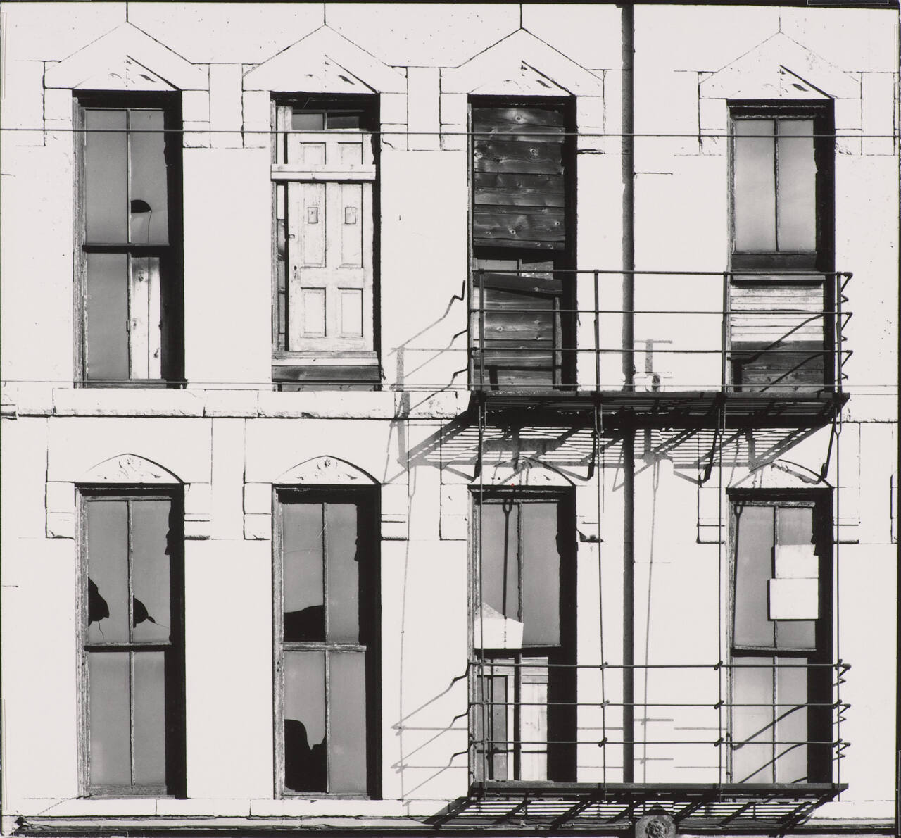 DescriptionImage of a building facade with two rows of windows, some with broken panes of glass others filled with scraps of wood.Copyright© The Estate of Harry Callahan. Courtesy Pace Gallery, New York.