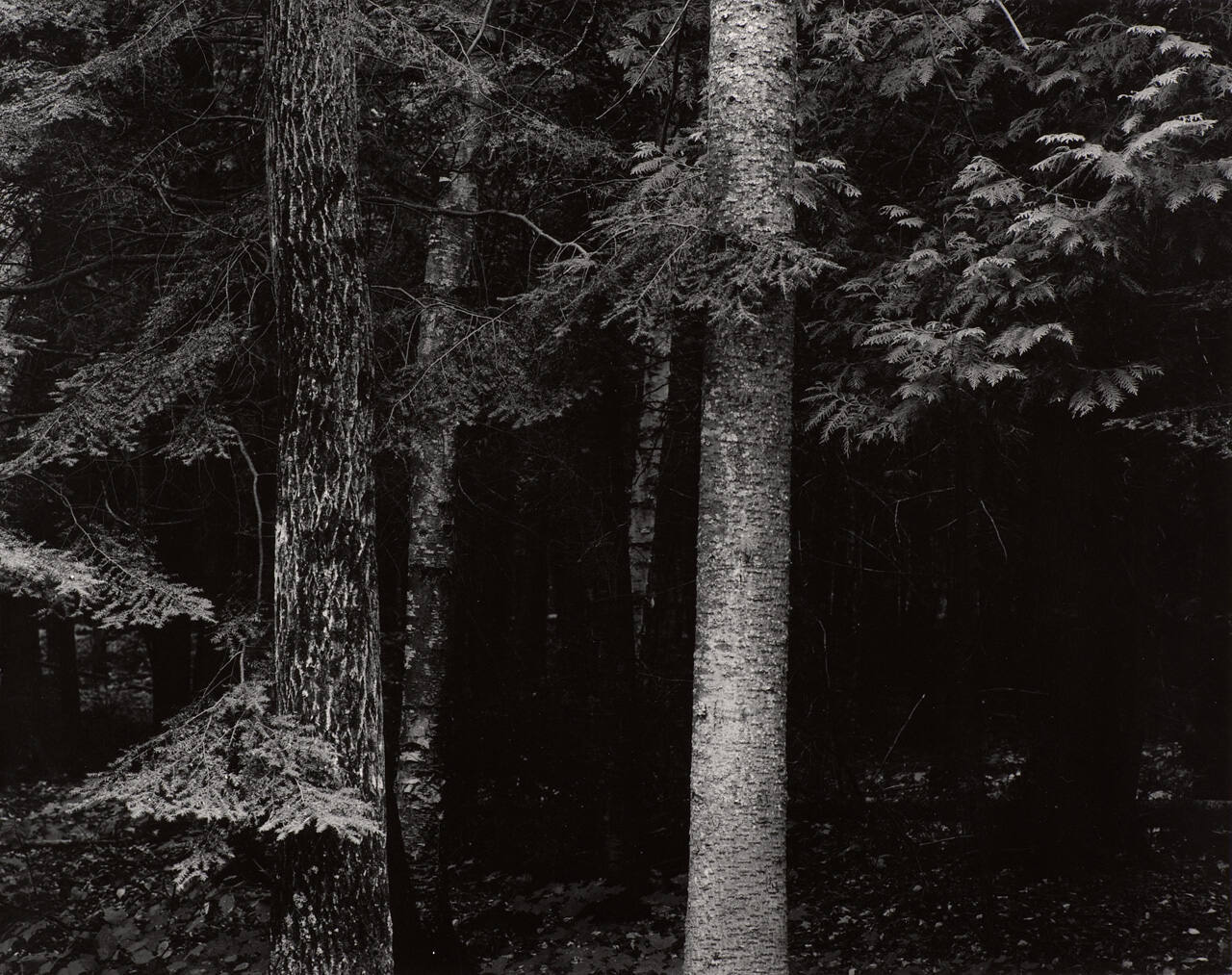 DescriptionImage of trees with evergreen branches; the bark on the left tree is rougher and darker than the one on the right.Copyright© The Estate of Harry Callahan. Courtesy Pace Gallery, New York.