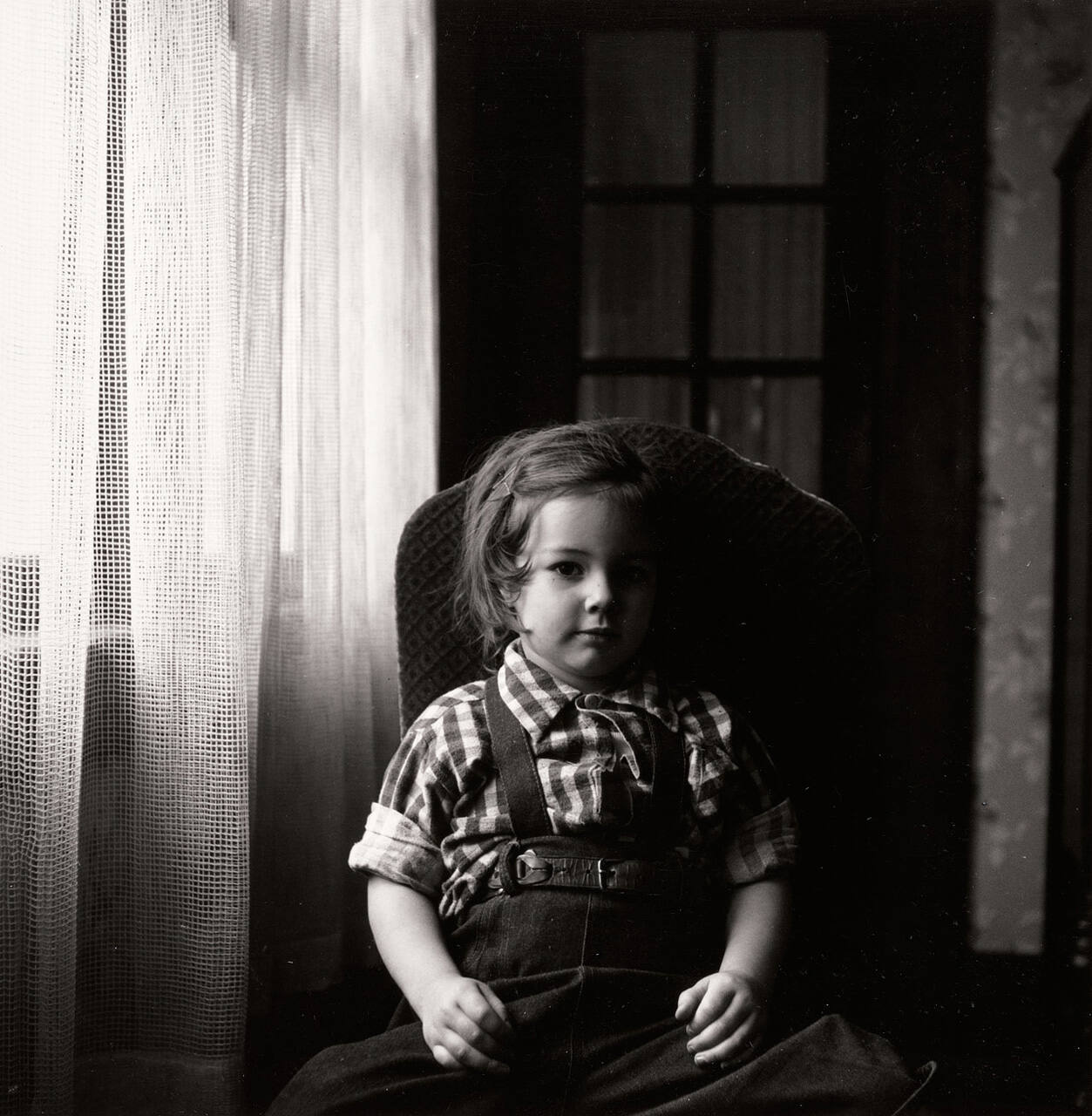 DescriptionImage of a young child seated beside a window in her hands in her lap. She's wearing a checkered shirt with overalls. Light from the window highlights the right side of her face leaving the left side in darkness.Copyright© The Estate of Harry Callahan. Courtesy Pace Gallery, New York.