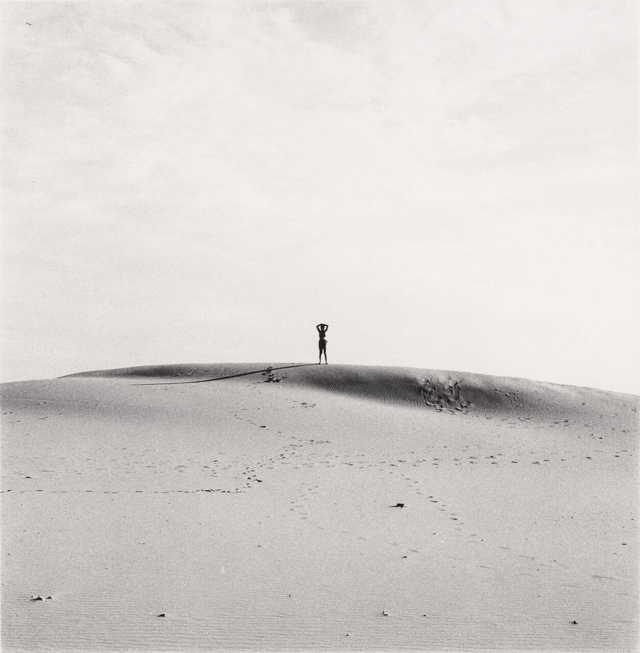DescriptionImage of a woman standing at the top of a sand dune. Her arms are draped over her head and two sets of footprints lead up to her.Copyright© The Estate of Harry Callahan. Courtesy Pace Gallery, New York.