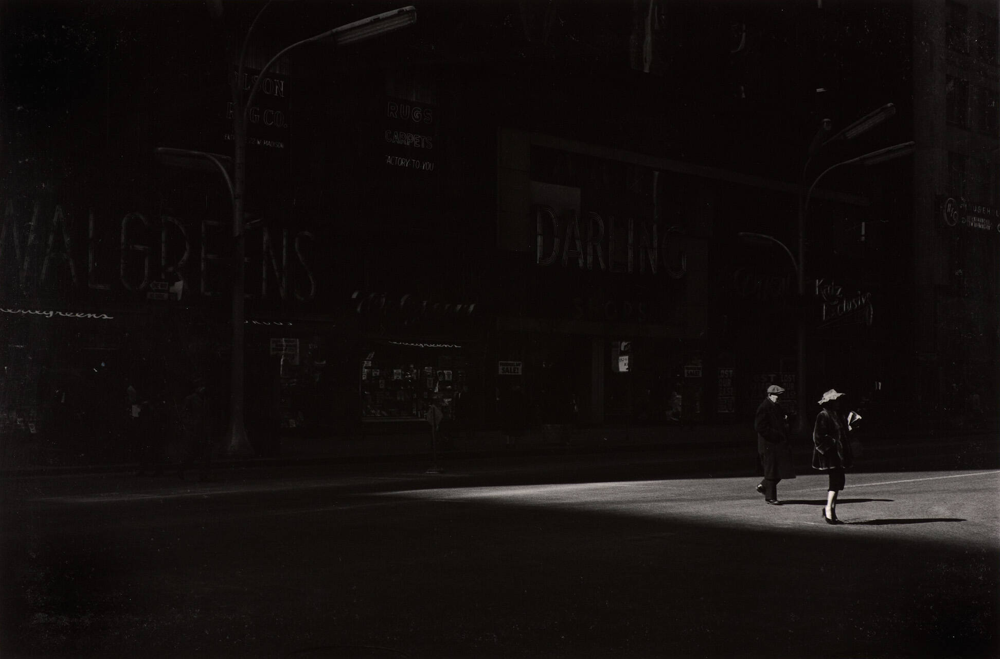 DescriptionImage of a man and a woman crossing the street in a narrow triangle of light. The surrounding area and buildings in the background are in dark shadows.Copyright© The Estate of Harry Callahan. Courtesy Pace Gallery, New York.