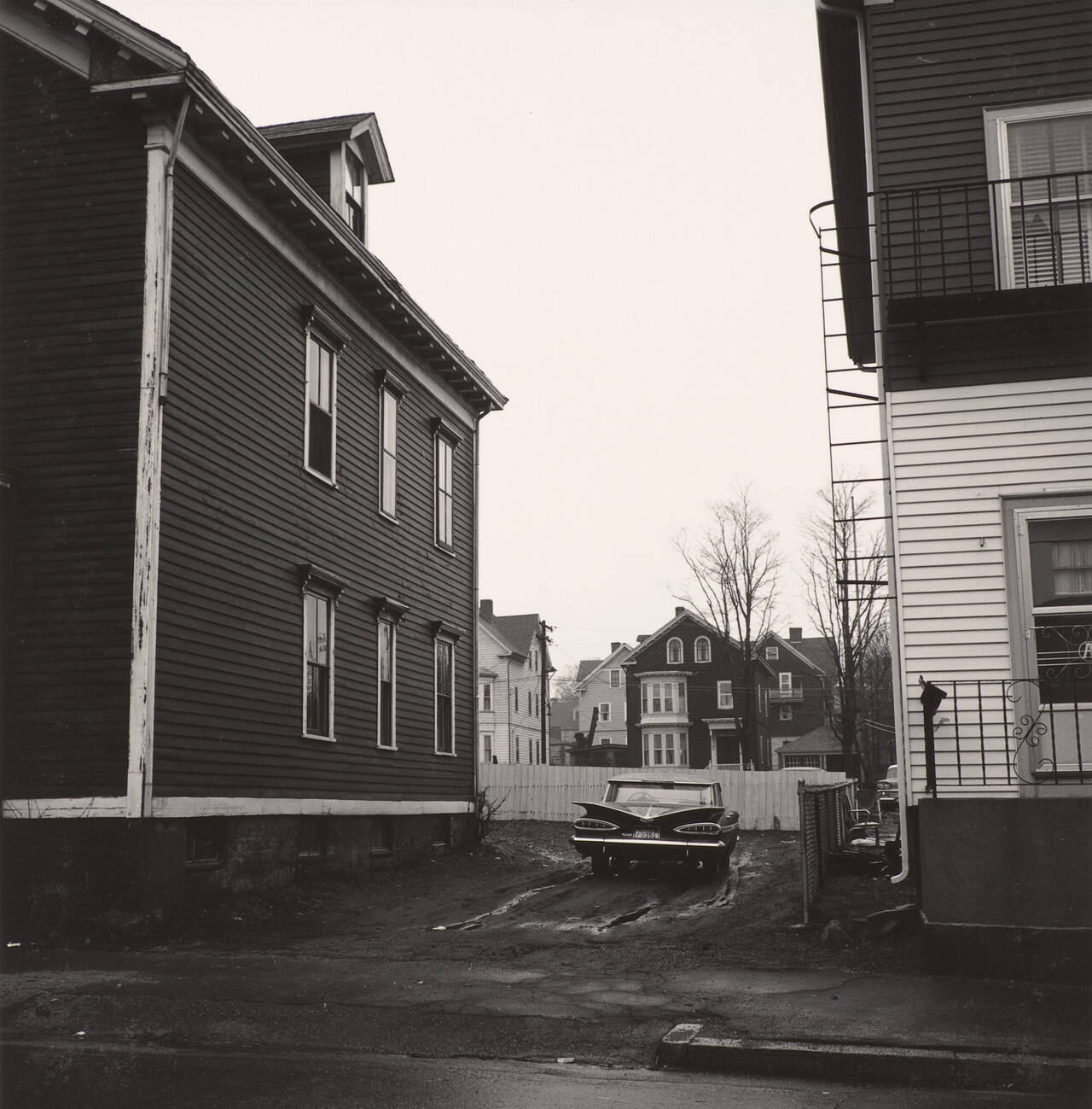 DescriptionImage of a car parked in a muddy area between two multi-story residential buildings. The car faces a white wooden fence which overlooks other homes and two bare trees.Copyright© The Estate of Harry Callahan. Courtesy Pace Gallery, New York.