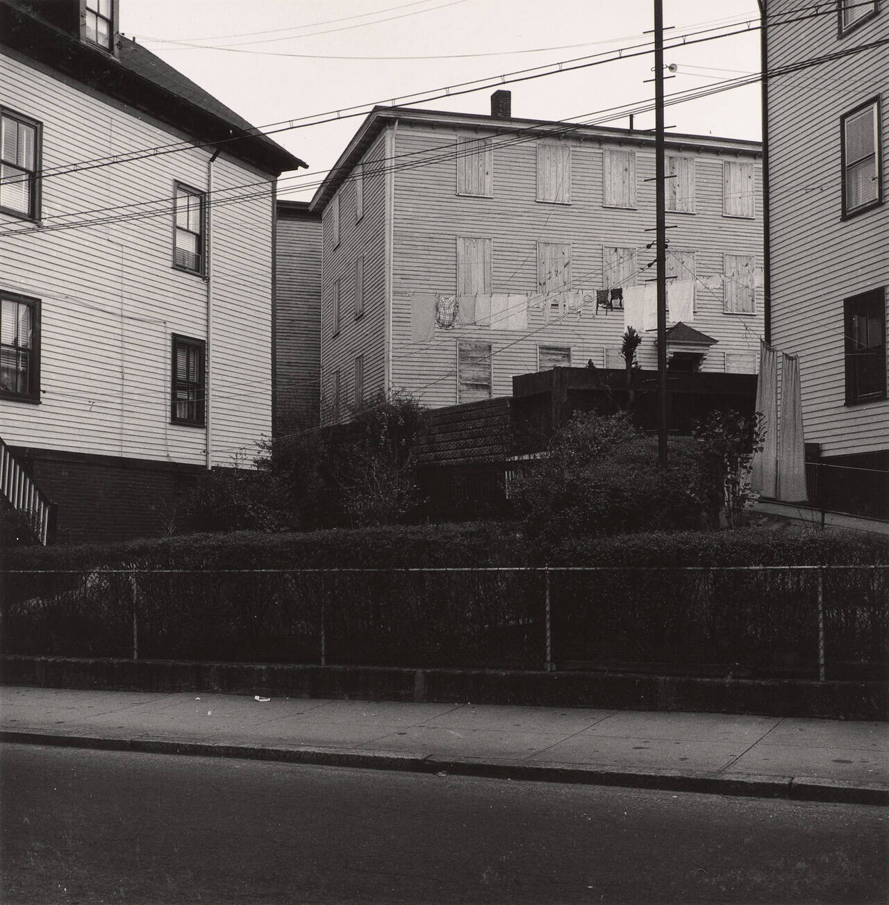 DescriptionImage of multi-story homes with laundry hanging to dry across a clothes line in the center of the image. In front of the homes there is a row of bushes behind a chain-link fence.Copyright© The Estate of Harry Callahan. Courtesy Pace Gallery, New York.
