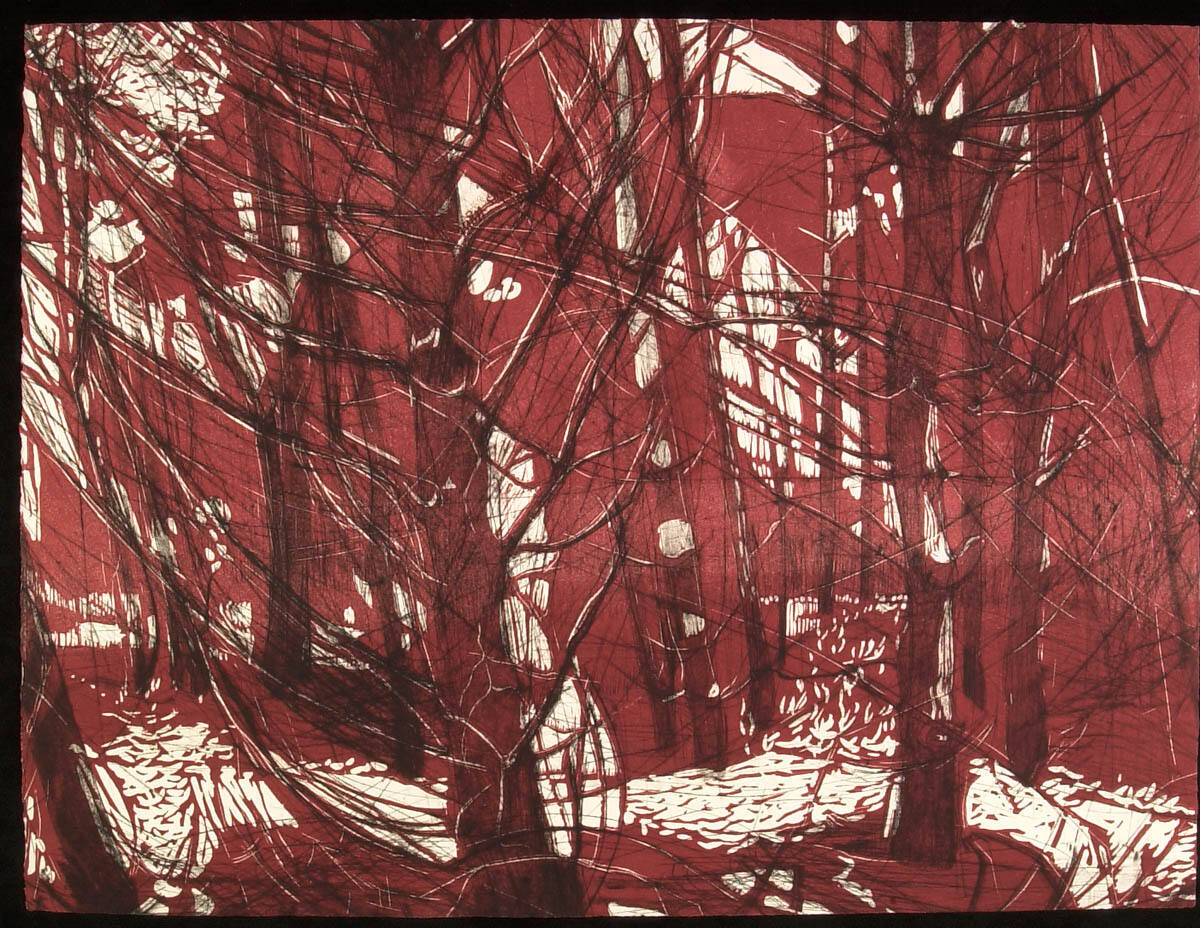 DescriptionLoose, sketchy depiction of a forest scene in red and black, with the white of the paper showing through.Copyright© Kathy T. Hettinga