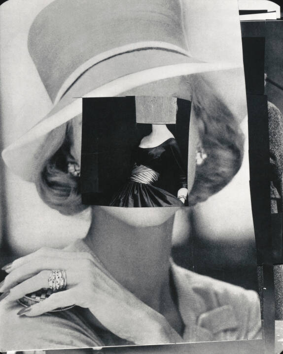 DescriptionImage of a woman wearing a hat and resting her hand on her shoulder; her face is 'cut out' and replaced with an image of a woman's torso in a dress.Copyright© The Estate of Harry Callahan. Courtesy Pace Gallery, New York.
