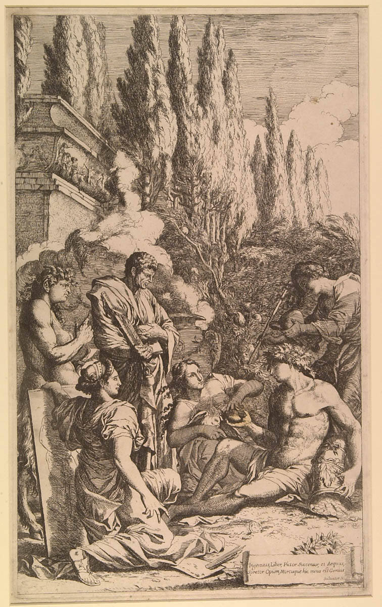 Salvator Rosa was best known for his wild landscapes, but he sometimes invented complex allegories like this example. The “genius” of the artist is represented by the reclining young man. He offers his heart to a figure holding a dove, symbolizing peace, under which the arts flourish. The woman placing the liberty cap on her head signifies artistic freedom, and the kneeling woman to the left with a canvas represents painting.