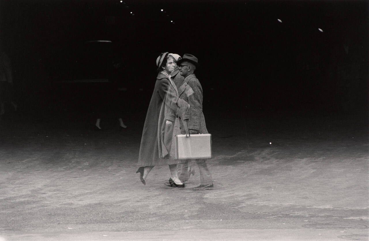 DescriptionMultiple exposure image of overlapping figures in profile near the center of the frame. They walk along a gray-toned path with a dark nondescript background.Gallery LabelPedestrians lost in thought were frequent subjects for Harry Callahan. To create this photograph of intersecting pedestrians on a Chicago sidewalk, he took three different photographs without advancing the film in his camera. This technique, called multiple exposure, overlaps each image onto a single film negative, creating the ghostly impression of three converging figures. Callahan used this technique to express the psychological experience of walking in the city alone, but together.
