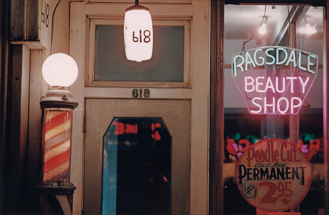DescriptionImage of a store front with a neon sign in the window which reads "Ragsdale Beauty Shop". To the left of the door, marked 618, is a barber's pole.Gallery LabelHarry Callahan chose to photograph this storefront in color to capture its glowing neon sign and the vibrant window reflections. Available light is often an issue when photographing at night, but at this beauty shop, Callahan found all the light he needed to document its rich details.