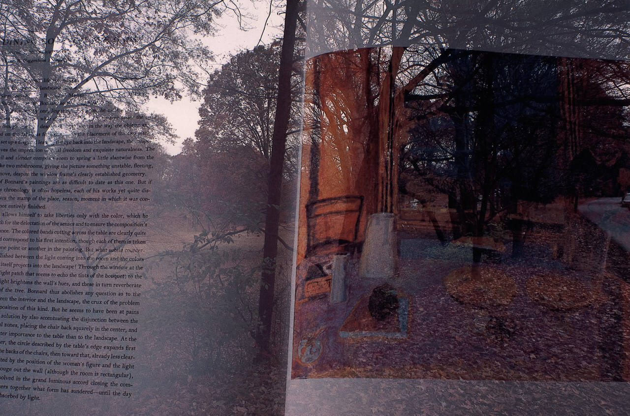 DescriptionMultiple exposure image of trees with leaves covering the ground; on the left is a text page.Copyright© The Estate of Harry Callahan. Courtesy Pace Gallery, New York.