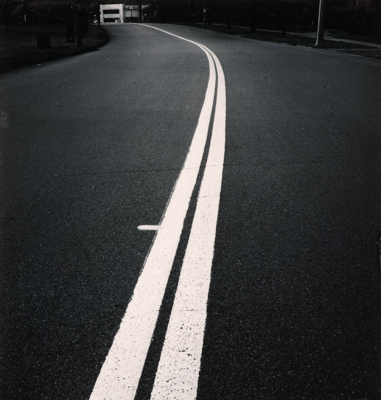 DescriptionImage of parallel stripes down the center of a two-lane highway' they wind to the upper left and disappear at the top of the road.Copyright© The Estate of Harry Callahan. Courtesy Pace Gallery, New York.