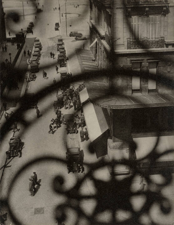 László Moholy-Nagy took this photograph from an elevated perspective and through the blurred grillwork of a balcony. This photograph compresses foreground and background together. The effect is an image that is optically true yet alien to common visual experience. The vantage point transforms an ordinary street scene into a dynamic interplay of forms. Such experimentation characterizes the approach of Moholy-Nagy, who was fascinated by photography’s expressive range and used a variety of unusual techniques.