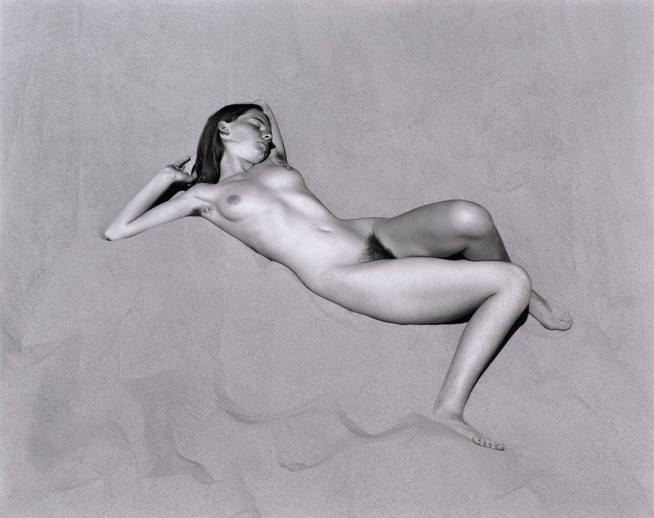 DescriptionFemale nude with hands behind head laying in sand. Exhibition History