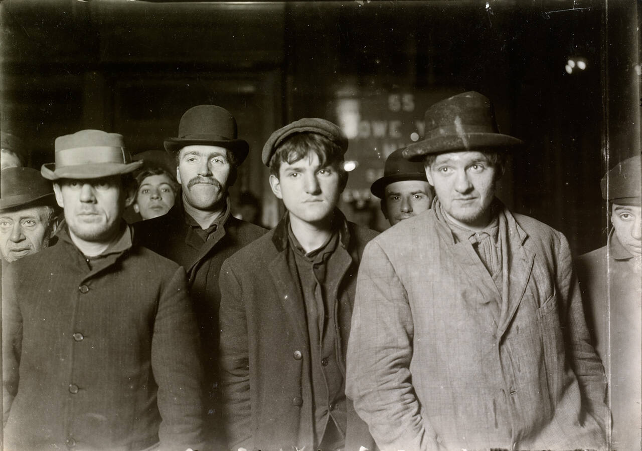 InscribedOn sheet verso, center, in gold pen: "Midnight at the Bowery Mission / bread-line, on the Bowery - / in the old days of depression / & winter. / Hine"