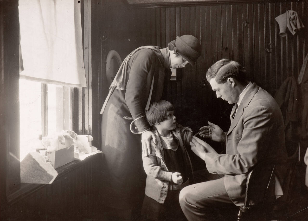 InscribedOn label adhered to sheet verso, top, iin black type: " " That's a brave girl." / In a rural clinic, western New York, 1930 / Milbank Memorial Fund / By Lewis Hine"