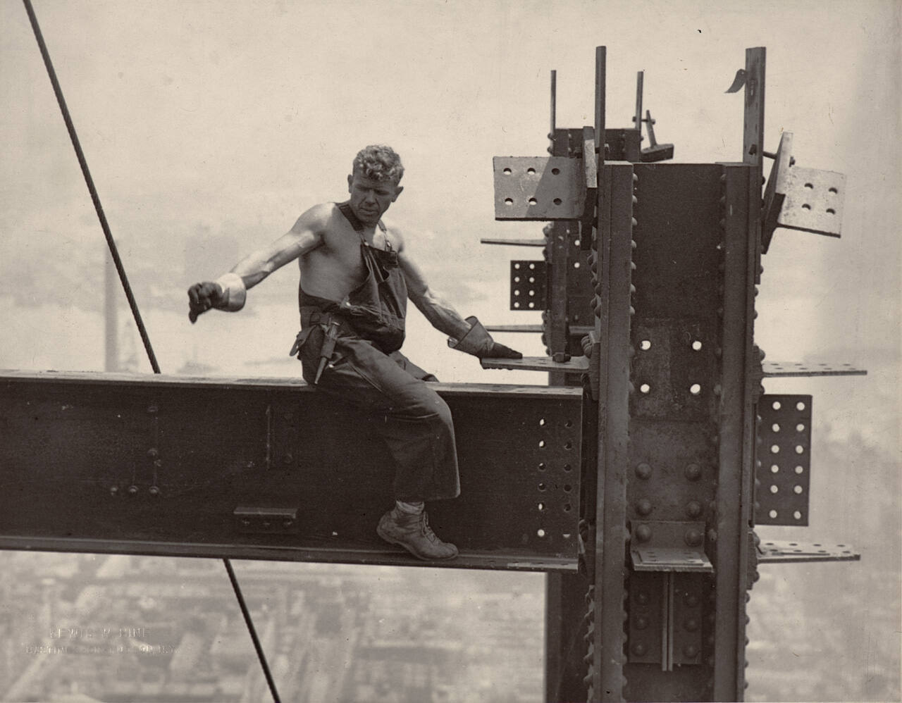 DescriptionImage of shirtless man wearing overalls, boots, and leather gloves sitting on a metal beam high above the city.Gallery LabelLewis W. Hine devoted his life to improving exploitative American labor practices, celebrating workers’ accomplishments, and advocating for the dignity of immigrants through photography. During the construction of the Empire State Building in 1930–1931, Hine scrambled about the towering structure to record laborers working in incredibly dangerous situations. His photographs, like this one of a man laying a beam, celebrated the courage, skill, and daring of these anonymous artisans.