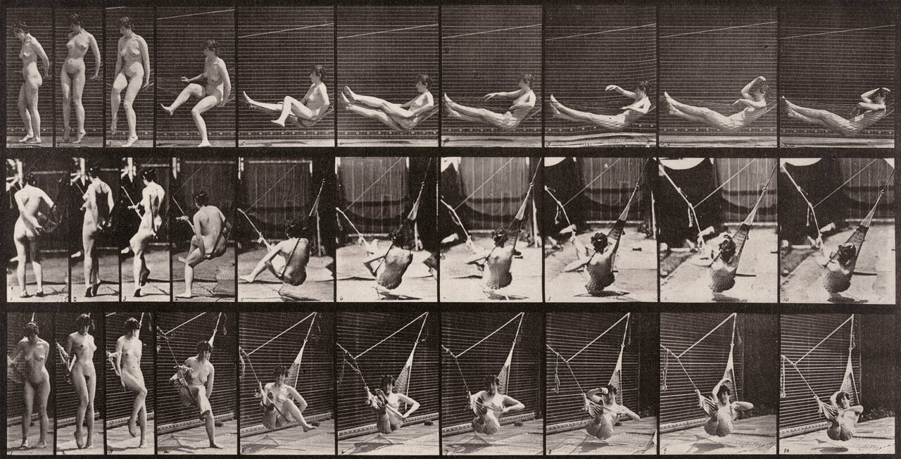 Animal Locomotion: Woman getting into hammock (plate 261)