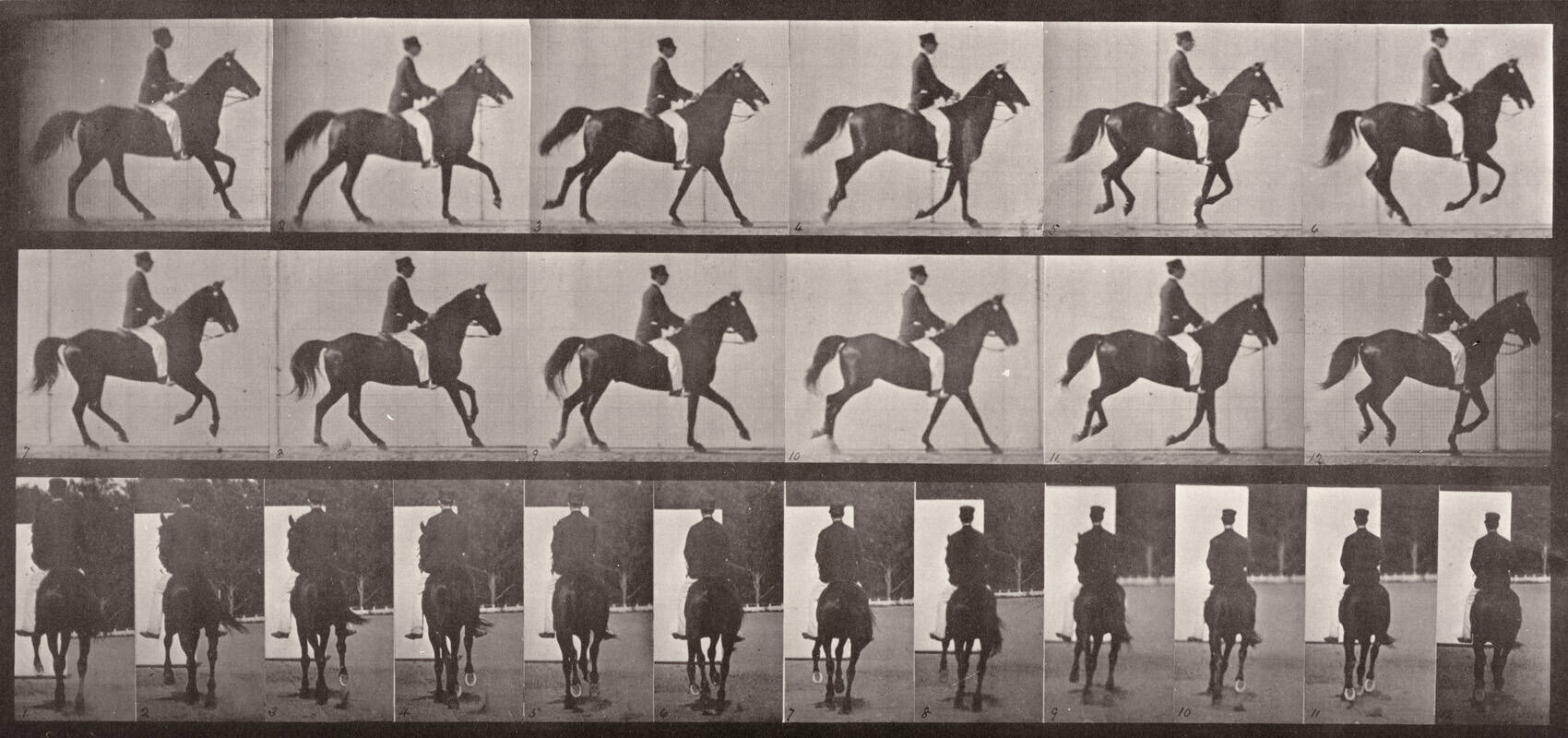 DescriptionGrid composed of 24 images in 3 rows. The top two rows are images of a rider on horseback made in rapid succession. The bottom row depicts the rider and horse from the backside, facing away from the viewer.ProvenanceHallmark Cards, Inc., Kansas City, MO, 1975;