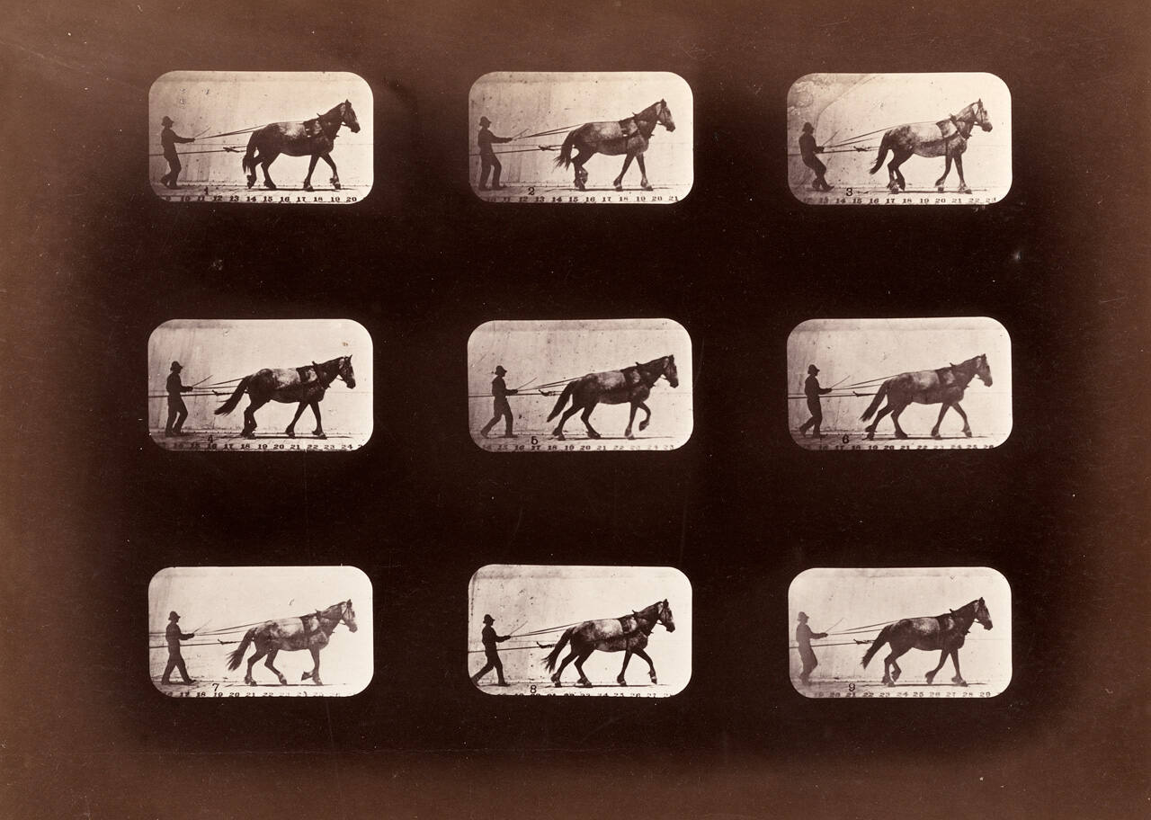 DescriptionA grid of 9 images of man diriving a horse made in rapid succession.Gallery LabelBy the late 1870s, the increased sensitivity and efficiency of the dry-plate process transformed photographic practice by allowing increasingly rapid exposures. Using exposures as short as 1/2000th second, Eadweard Muybridge used this new technology to exhaustively record human and animal movement. His technique involved the use of two batteries of twelve cameras each to produce both lateral and front views of simple actions. The resulting images multiply space and fragment time, creating effects that are both scientifically true and curiously alien to “normal” perception.
