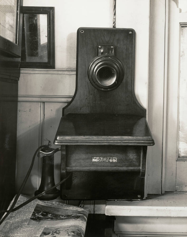 Wright Morris achieved renown as both a writer and a photographer. Combining these skills, he created the influential photo-text volumes The Inhabitants (1946) and The Home Place (1948). This photograph is from The Home Place, a detailed study of the small farming town in Nebraska in which Morris had been born. Morris spent several weeks in Central City in the spring of 1947 recording familiar things—chairs, doorways, family photographs or an old public telephone—to suggest the texture of a vanishing way of life.