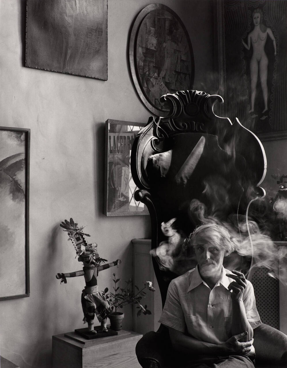 DescriptionImage of a man (Max Ernst) seated in ornately carved chair, smoking a cigarette. Several painting, including female nude hang on walls behind him. Small figural sculpture on shelf next to him.Exhibition History