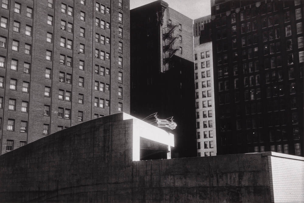 DescriptionSky scraper buildings in background and reaching out of frame. In center of image, the back end of a mid-20th centruy make car is perched on top of a parking structure.ProvenanceEdwynn Houk Gallery, Chicago, IL;