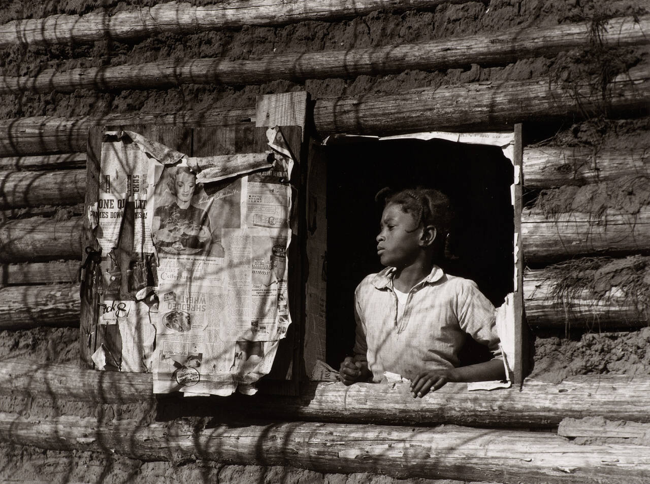 In this photograph, a young girl gazes out the small window of a log cabin in Gee’s Bend, Alabama. This small, African American community, now celebrated for its multi-generational quiltmakers, was home to tenant farmers and sharecroppers who tended the same land as their enslaved ancestors.