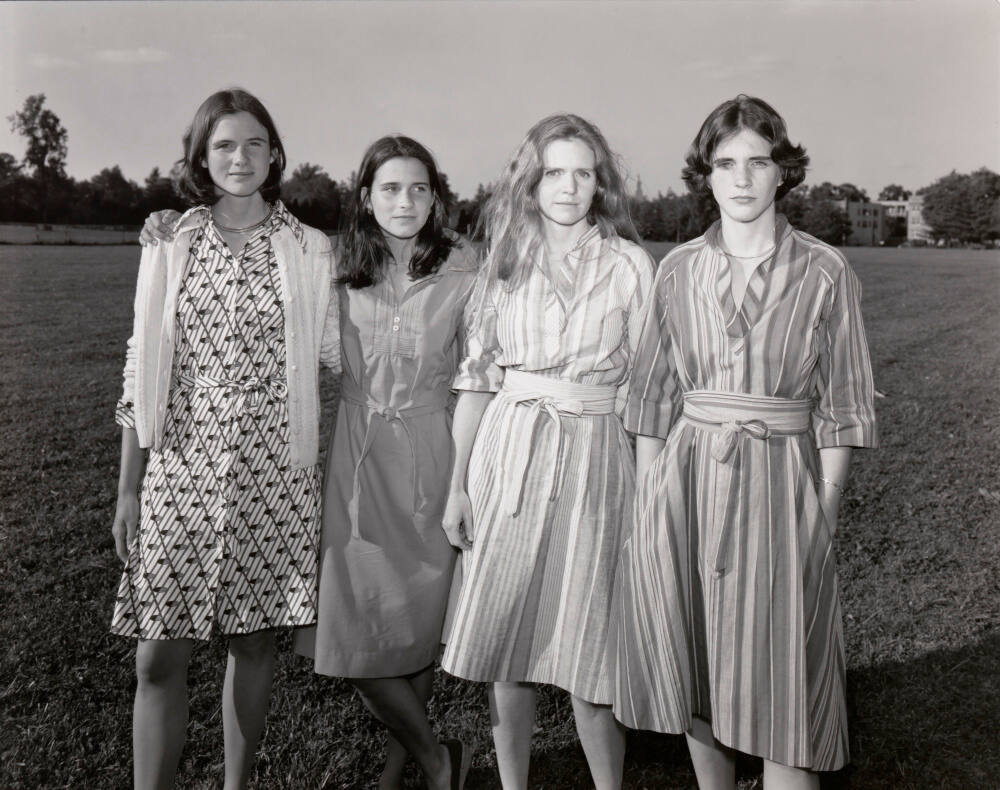 DescriptionImage of four women wearing knee length dresses standing in a grassy field.Copyright© Nicholas Nixon