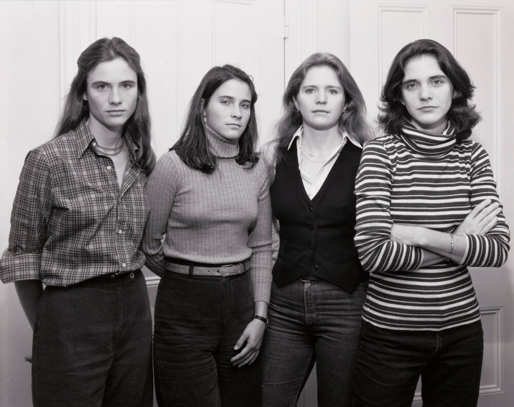 DescriptionImage of four women standing next to one another and looking directly at the viewer. The woman on the far left wears a plaid button-up shirt.Copyright© Nicholas Nixon