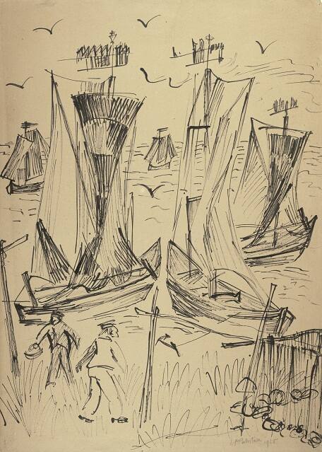 Fishing Boats, captures the dynamic movement of boats with sails that sweep upward, showcasing Max Pechstein’s exceptional skill in drawing with a flat-nibbed ink pen. The artist created this piece while living in Berlin during his time as a member of the influential group, Die Brücke (The Bridge).