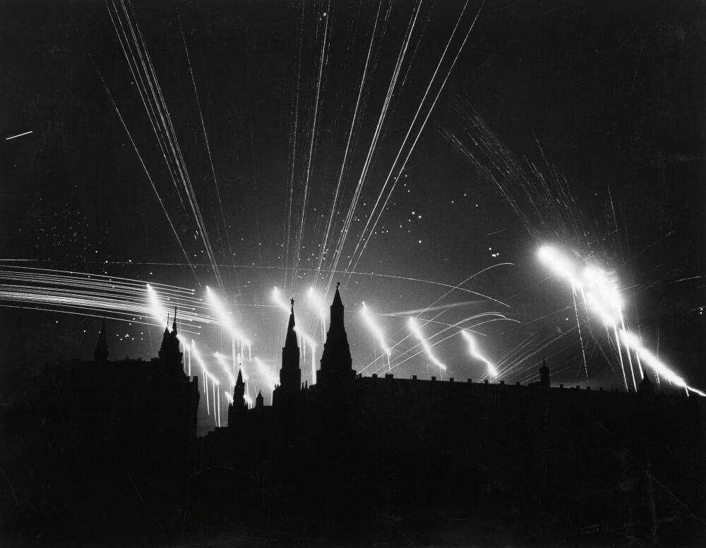 On assignment during World War II for Life magazine, Bourke-White made bold and dramatic photographs under often perilous conditions. She began recording the conflict even before the U.S. became involved: this dramatic shot of a nighttime raid by German bombers was made in Moscow. From 1942 to 1945, Bourke-White photographed intensively throughout England, Italy, and Germany and even became the first woman to accompany an Air Force crew on a bombing mission.