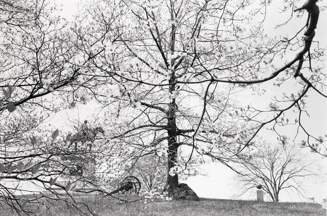 Lee Friedlander came to critical attention in the early 1960s for his artfully complex views of the American social landscape. His images range in mood: they are, by turns, witty, surreal, critical, and elegiac. Characteristically, however, they are both visually dense and rich in cultural references. This depiction of Civil War monuments seen through a screen of budding branches stimulates a variety of thoughts on time, the cycles of life and death, and the nature of our national memory and ideals.