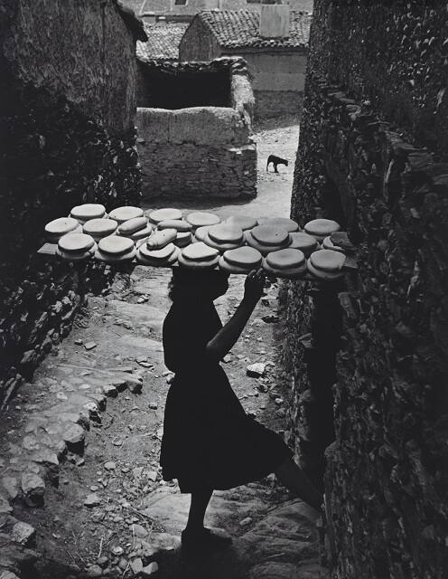 DescriptionImage of a woman carrying a tray of round bread loaves over her head. She's entering a doorway on the right in an alley with a small dog in the background.Gallery LabelThis image was first published in W. Eugene Smith’s photo essay “Spanish Village: It Lives in Ancient Poverty and Faith,” in the April 9, 1951 issue of LIFE magazine. Praised for its poignant depiction of impoverished rural life under the dictatorship of Francisco Franco (1892–1975), the essay emphasized the humanity of the village’s residents as they went about their daily chores, despite their lack of modern facilities. The caption to this image describes 18-year-old Bernadina Curiel, engaged in “young woman’s work,” that required her to bake, at least once a week, “24 loaves of bread for the family of eight.”