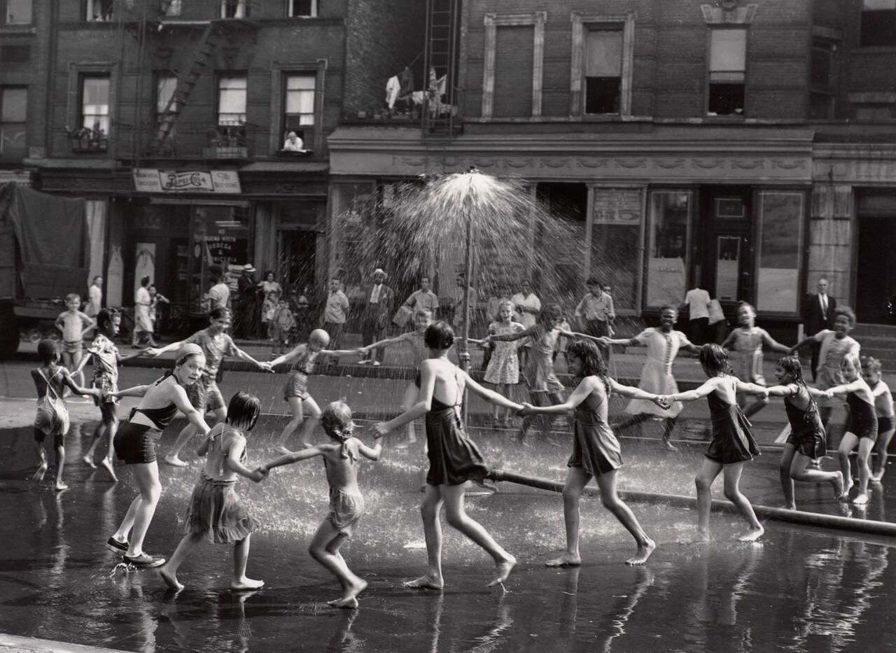 After wartime service in the Pacific, Todd Webb arrived in New York in late 1945 and soon became part of the city’s photographic community. Many of his early images evoke a spirit of kinship and community—a reflection of the nation’s desire to return to normalcy after the war. Webb had a deep interest in vernacular culture and the rhythms and artifacts of everyday urban life. Here, a water hose has been rigged to provide city children with some much needed relief from the summer heat.