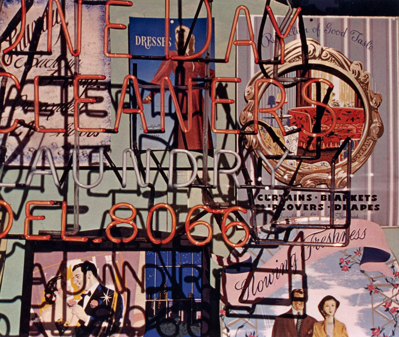 In this photograph, a colorful cacophony of neon letters, cast shadows, and storefront advertisements merge in a dynamic display that is both descriptive and abstract.