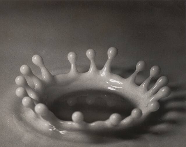 By the 1930s, engineering advances produced a remarkable expansion in the variety and sophistication of photographic applications. In 1931, Harold Edgerton—an electrical engineer affiliated with the Massachusetts Institute of Technology—perfected the stroboscope: a device that allowed him to arrest exceedingly fast movement and make exposures between 1/10,000 and 1/1,000,000 of a second. Edgerton made several studies of milk drops over the course of 25 years, in an effort to record a perfectly symmetrical coronet. His images, which captured subjects incapable of being seen by the naked eye, remind us of the unexpected beauty found in the most mundane subjects.