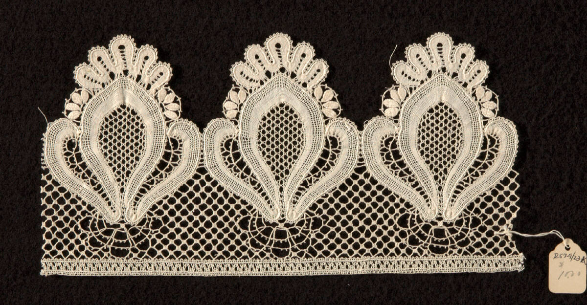 DescriptionBobbin-made tape lace; made insections. Whole and half stitch; a plaited mesh ground and decorative fillings of mesh and bars, some large wheat ears.
