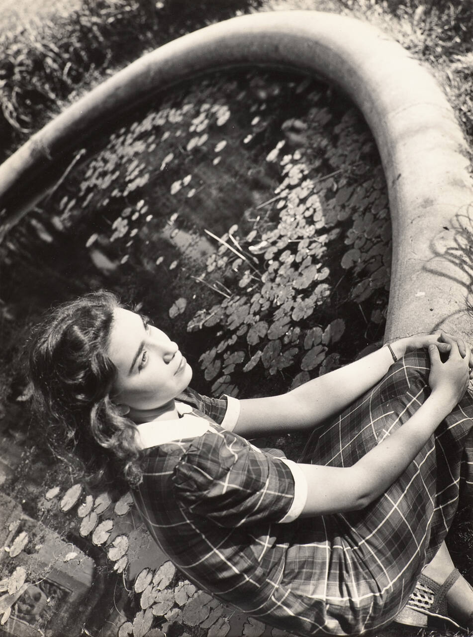 DescriptionVintage gelatin silver print of a girl sitting beside a lily pond.Copyright© The Historic New Orleans Collection