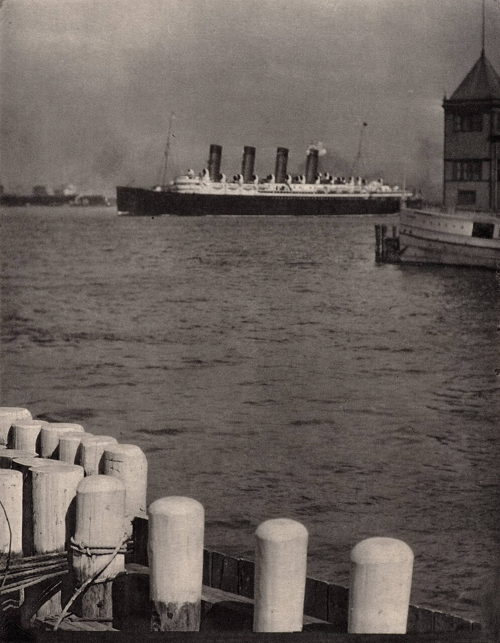 DescriptionImage of a ship, The Mauretania, near the horizon line with dock in the lower left corner of the foreground.ProvenanceEdwynn Houk, Chicago, IL;