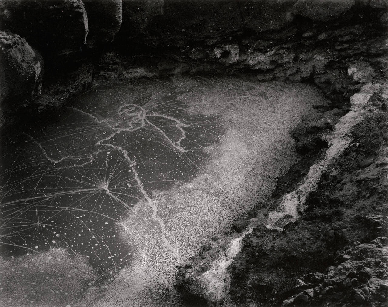 Wynn Bullock is known for his poetic studies of nature and the human figure. In images such as this, Bullock suggests a kind of cosmic mystery, a suggestion of the endless universe in the mud surface of a tide pool.
