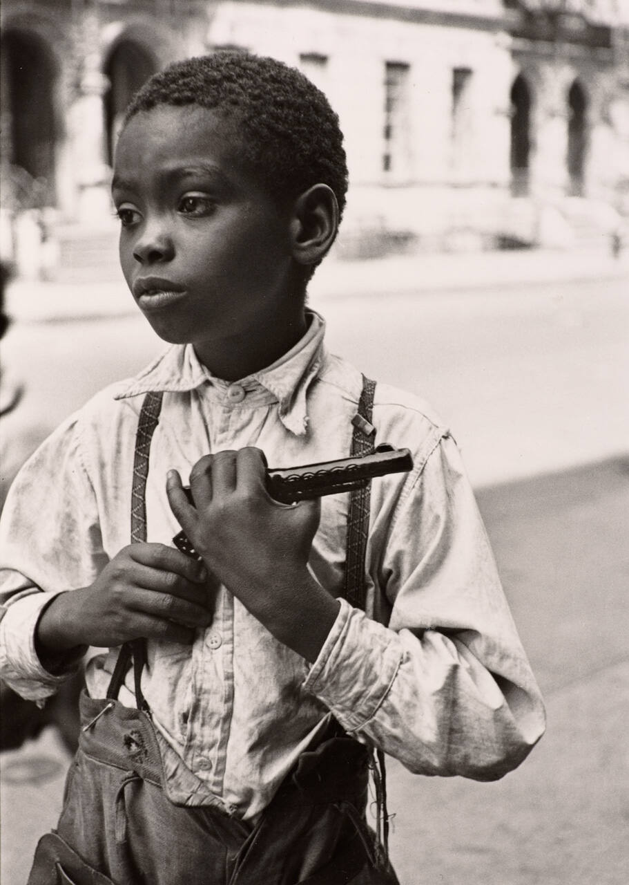 DescriptionGelatin silver print of a young black boy, holding a gun. Signature on back of print.