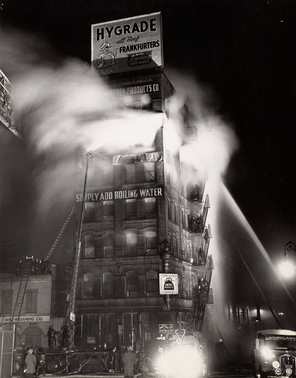 DescriptionImage of firemen putting out a fire in a tall building. Sign on top of the building reads: "Hygrade all beef Frankfurters". Sign on the side of the building reads: "Simply Add Boiling Water".Gallery LabelWith wry humor, Weegee took this image of firefighters dousing a fire at a hotdog factory
