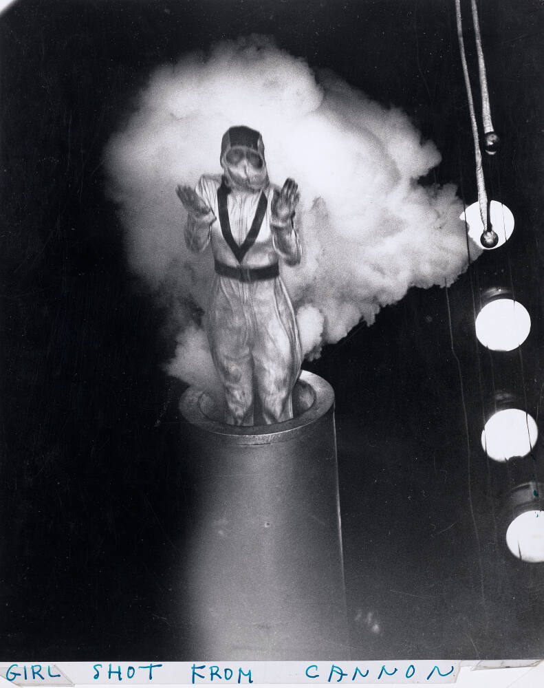 Working as a freelance news photographer in New York City, Arthur Fellig earned the nickname Weegee (after the Ouija board) for his uncanny ability to sense newsworthy happenings and to be the first on the scene. With a vision that is by turns sentimental, cynical and voyeuristic, Weegee recorded urban life as a grand human comedy. Characteristic of his unerring sense of the moment, this image of a woman being shot out of a cannon documents a famous circus act of the day with exuberant absurdity.