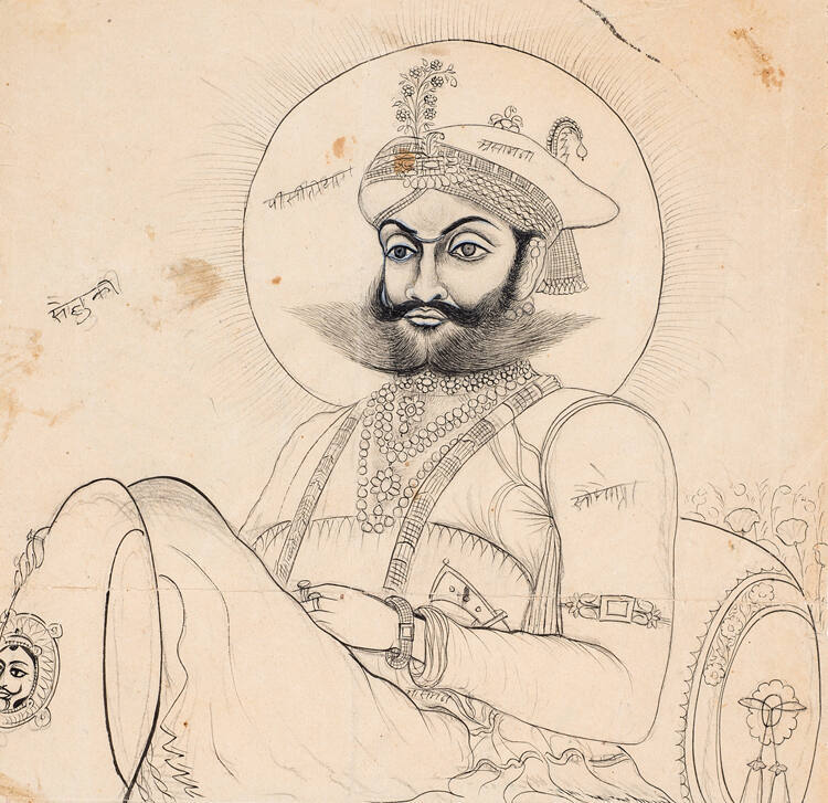 DescriptionMaharaja seated behind partially drawn draped balcony, mustached and bearded with halo. Wears ornamented turban, multiple necklaces, and high-waisted jamah tied under left arm. Rajasthani inscriptions indicate colors to be applied to large areas.