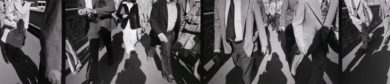DescriptionSeveral frames of images printed in a single row depicting a crowd of people walking on the sidewalk. Images cropped near shoulders, so faces are not visible. Most of the men are dressed in suits.Gallery LabelBarbara Crane used her camera’s wide-angle lens and printed multiple photographs together to make multipart panoramas that evoke the hurried, hectic atmosphere of Chicago commuters at rush hour. Crane made these photographs within the span of one minute. The late afternoon sun creates dramatic light and long shadows, allowing the artist to include herself among the moving crowds.