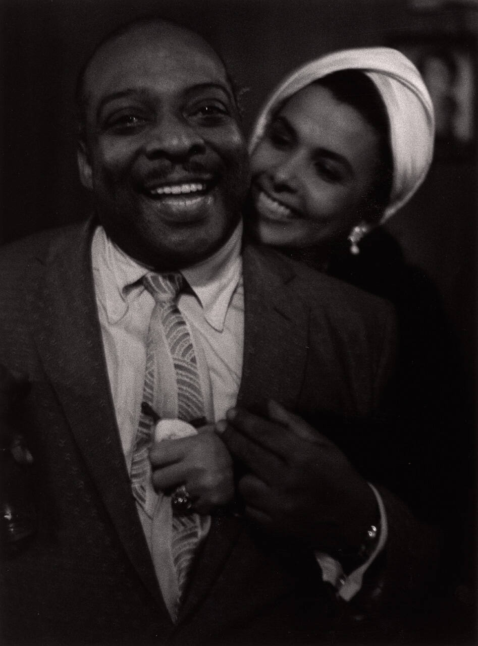 This portrait of Count Basie and Lena Horne evokes the warm, loving energy shared by two great musicians. As an artistic response to mass media stereotypes of African Americans, Roy DeCarava photographed Black subjects with grace, beauty, and dignity. He often used low, ambient light, and he embraced the lower register of the photographic scale—the rich and velvety beauty of gray and black.