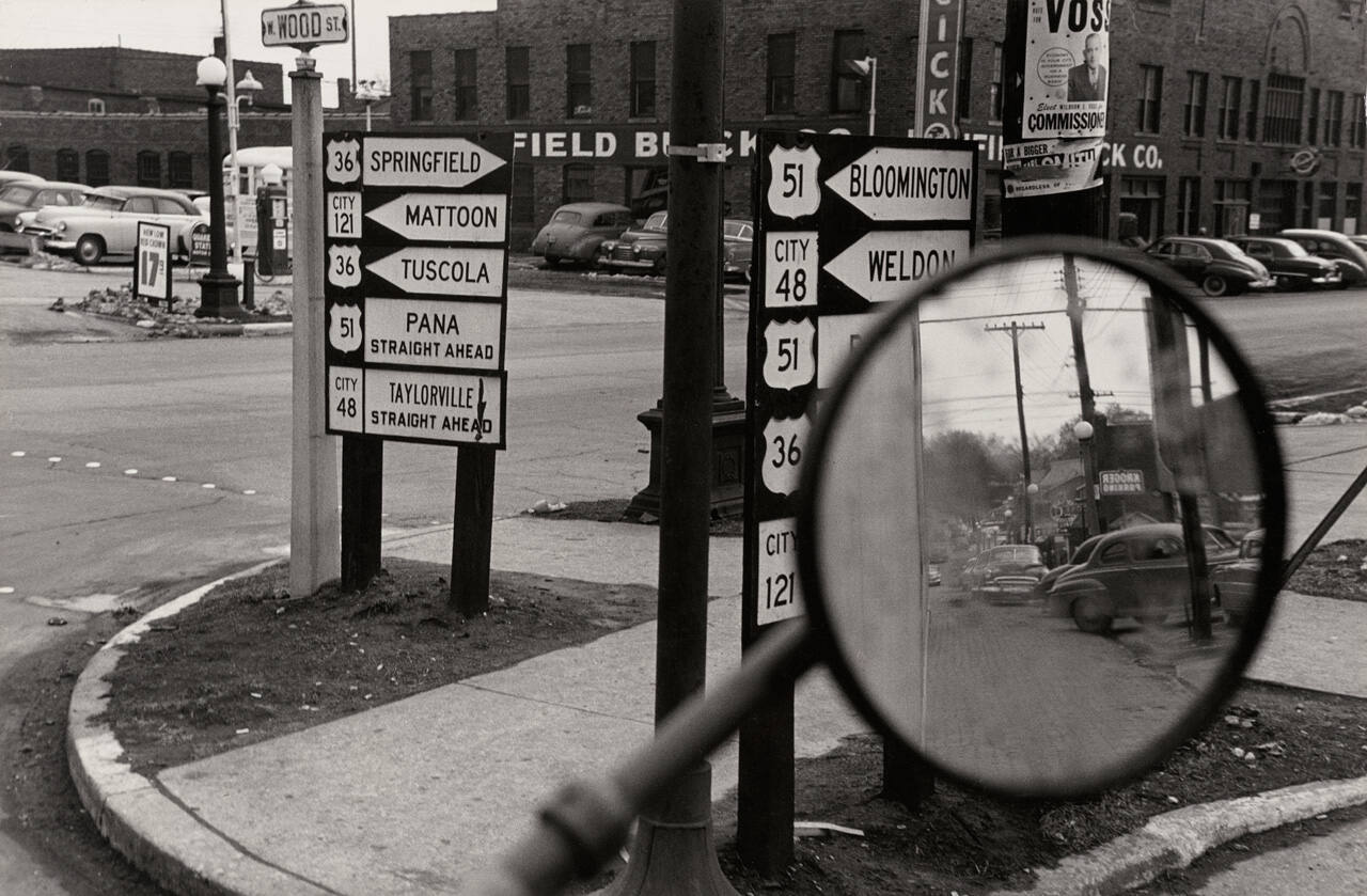 InscribedWhite label adhered to mount verso, center, typed in black ink: ""THROUGH A CROSS-COUNTRY TRUCK WINDOW - DECATUR, ILLINOIS / FOR FREHAUF TRAILER COMPANY"