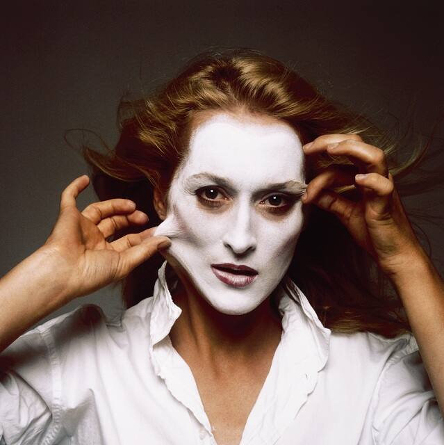 DescriptionImage of a woman, Meryl Streep, whose face is painted bright white. She uses her fingertips to stretch parts of her face.Exhibition HistoryA View of Her Own: Images of Women by Women Artists. Grinnell College, Grinelle, IA, October 2-31 , 1987, no cat.