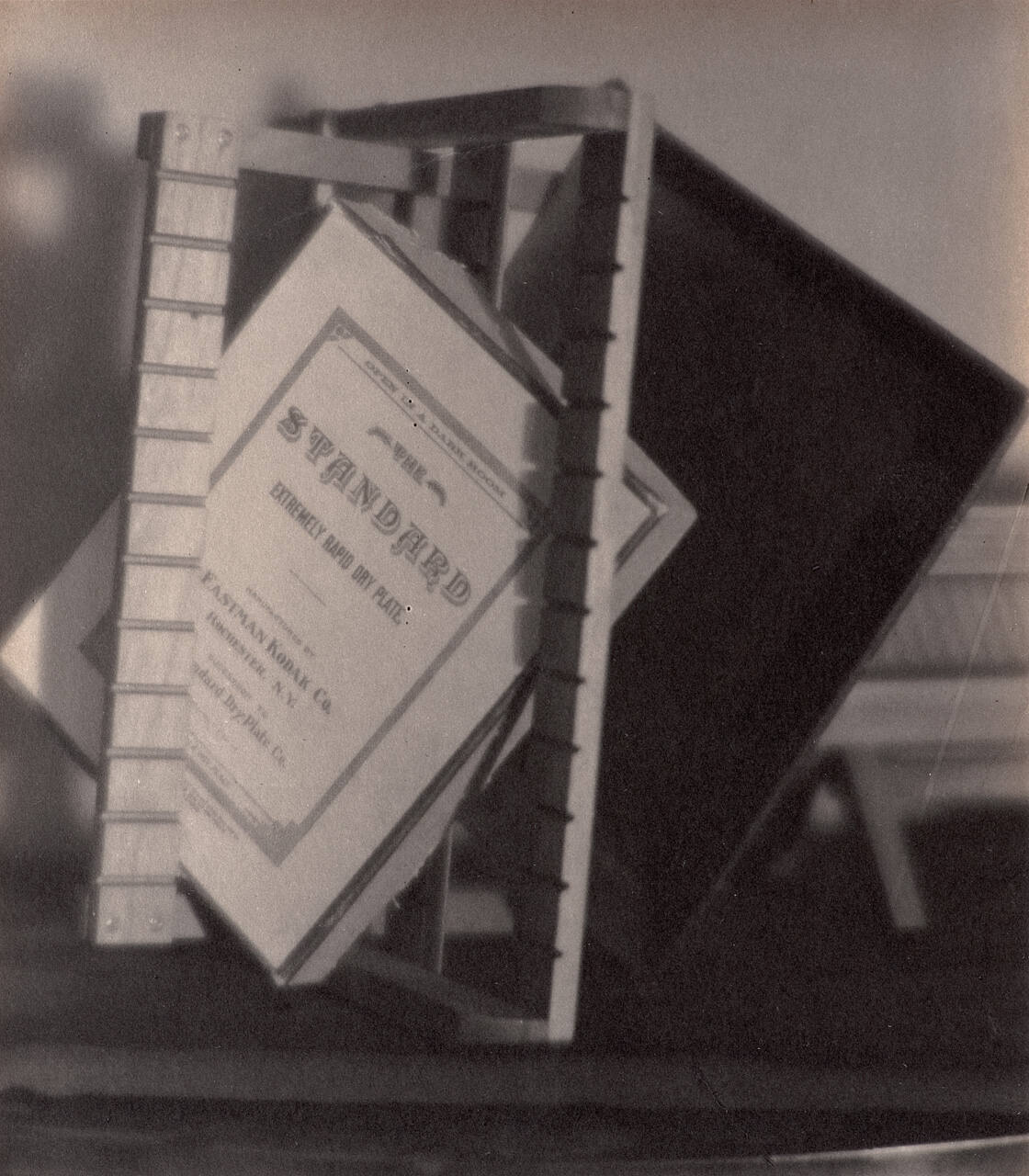 DescriptionImage of a Kodak box for a "standard extremely rapid dry plate" stored diagonally in a notched wooden stand.Gallery LabelThis geometric still life is made from items important to any artistic photographer of the time—a box of glass plate negatives and a rack used to dry them, turned on its side. This early image by Doris Ulmann was made at the beginning of her photographic career while she studied with noted photographer Clarence White. White’s teaching emphasized the importance of transforming the familiar world into semi-abstract geometric forms, a lesson Ulmann skillfully demonstrates in her photograph.