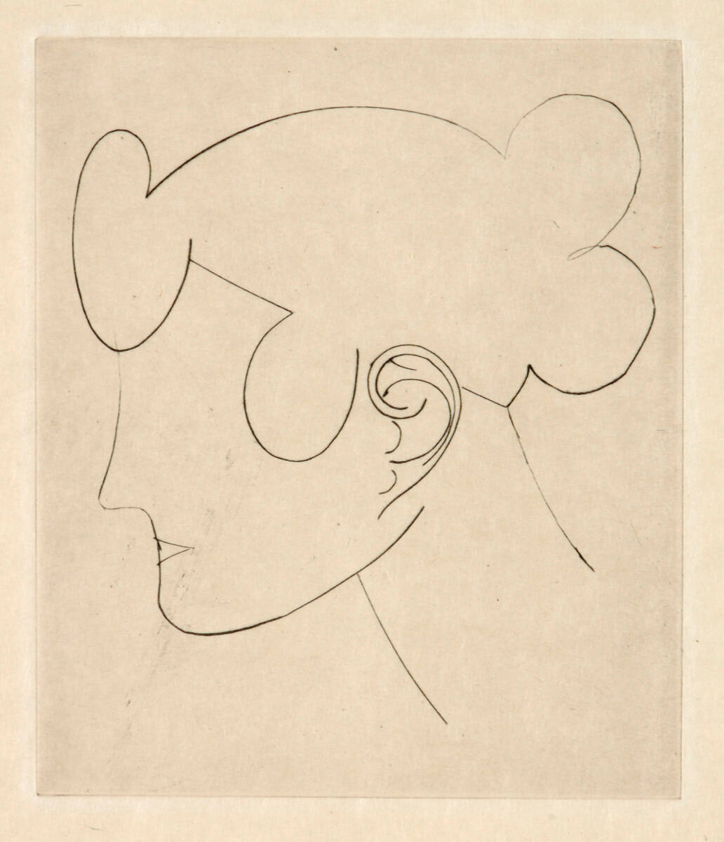 DescriptionLeft side of female head without eye and with helmet-like coiffure.